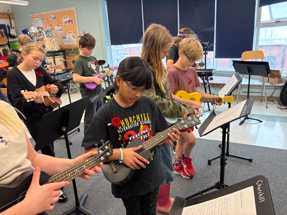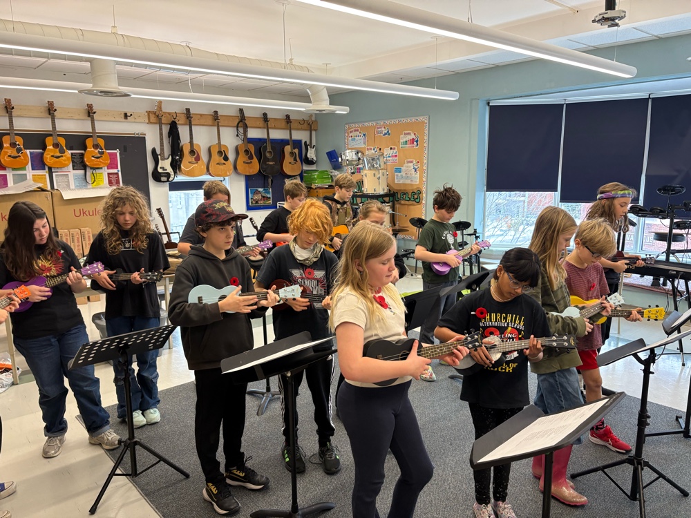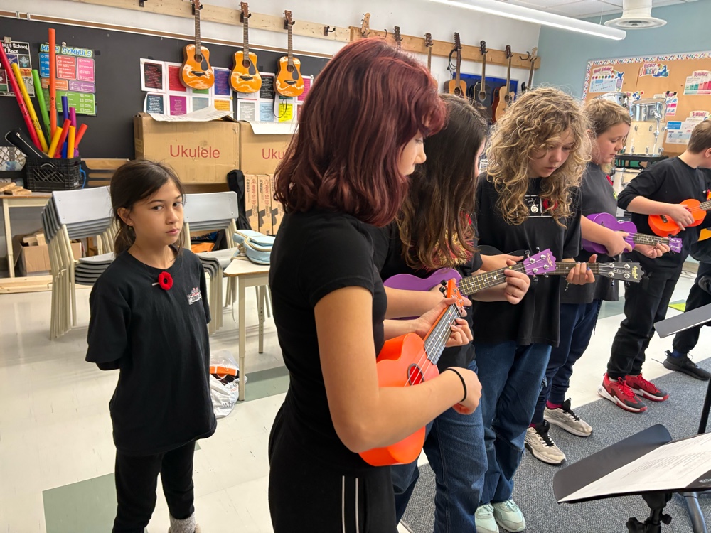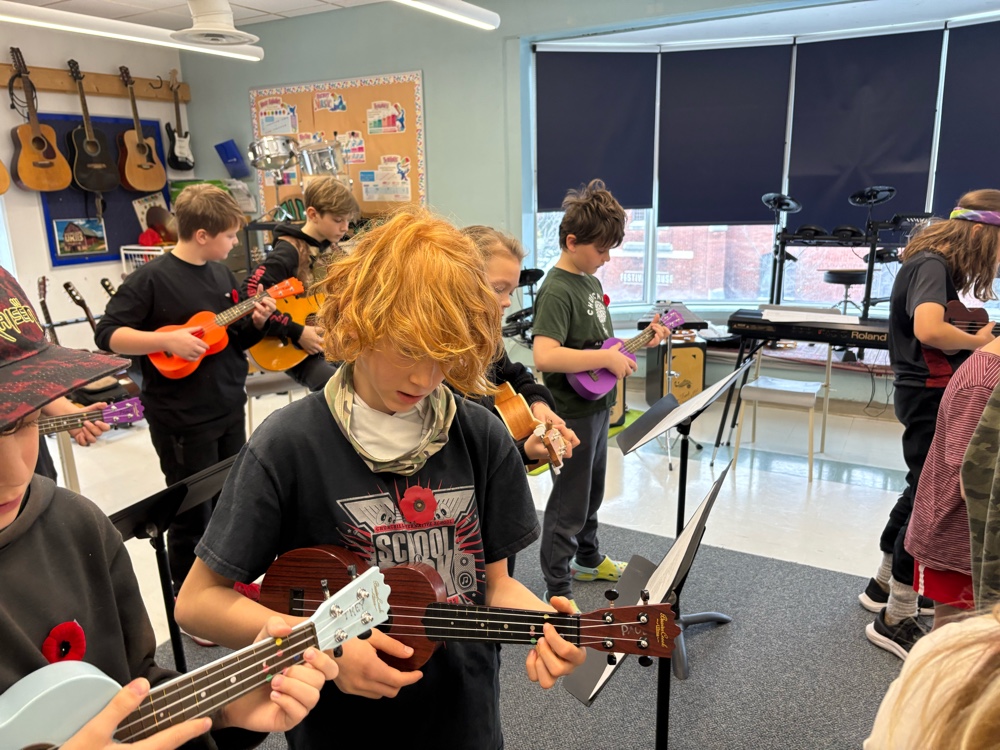 The students from room 207 really rose to the occasion today, showing up, dressed in black-and-white and putting on serious attitude for the events of the day. Our class was in charge of the sharing, so all of the introductions, and thank youse were handled by students from our class. In addition to that, our class prepared for over a week to perform a mini play about the highway of heroes. everyone who was present today played a role either for one part or for several. A couple people had to step in as under studies and pick up some pieces, but in the end, it was a rousing success. Just yesterday we decided that we needed to add something, so we rehearsed the song Highway of heroes by the Canadian band called the Trews. After our play finished, we rotated to ukuleles and guitars, and we sang the song beautifully. The ceremony went off very well, and we had lots of compliments from staff and parents who visited. At the end of the day, we walked down to the Westborough senator to take in the remembrance Day ceremony there. I had a few people speak to me after the ceremony and complement me on how well behaved the students were and how nice it is to see us at this local event.